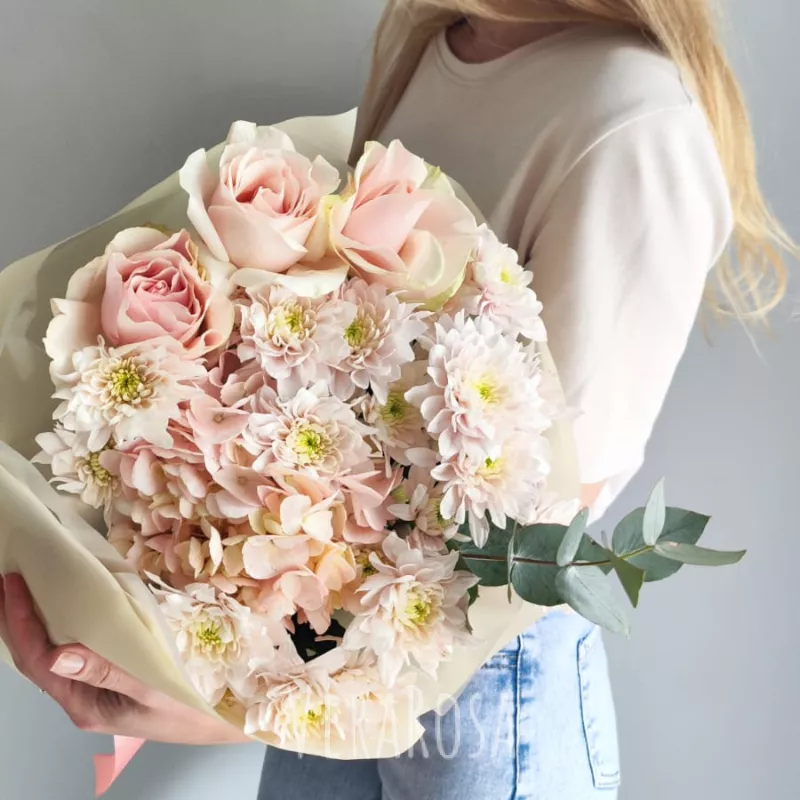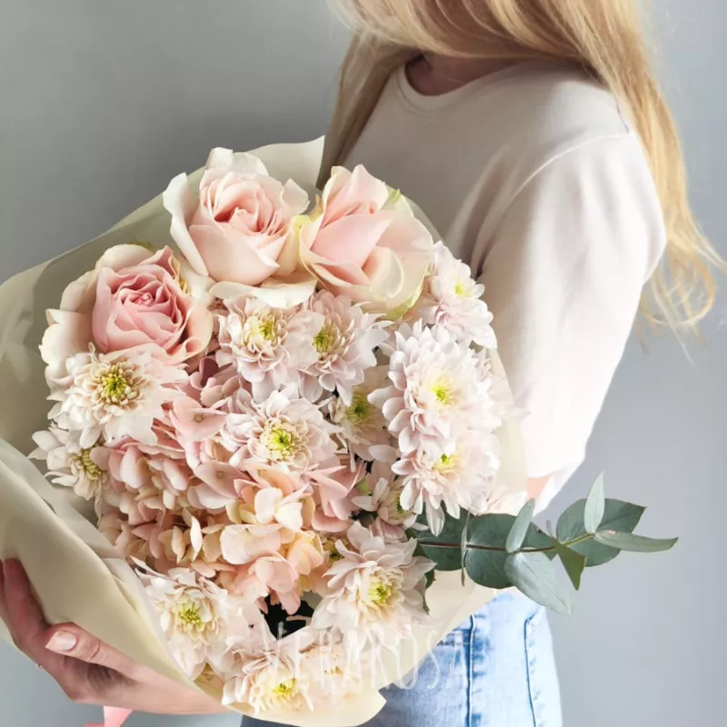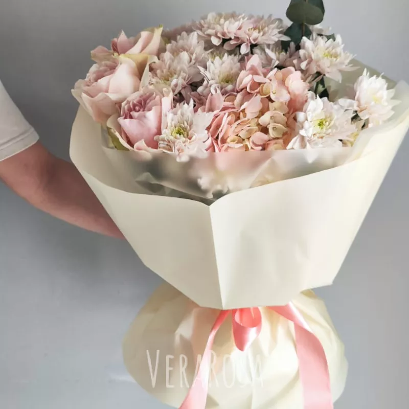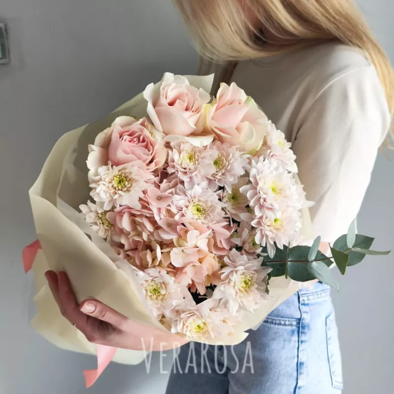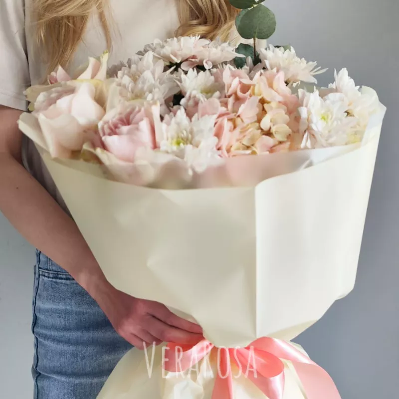 Нежный букет из гортензии, роз и хризантем