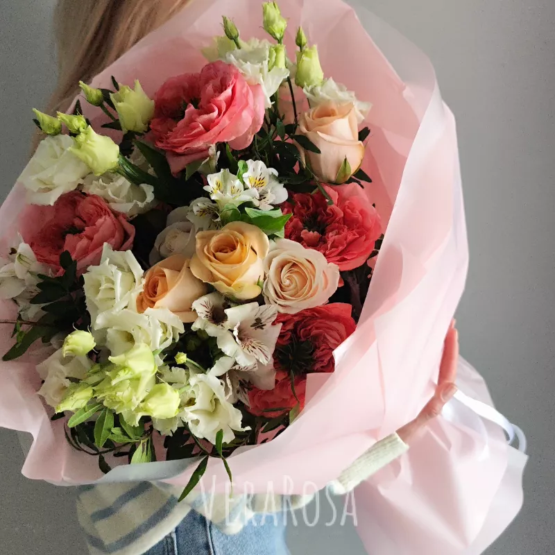 Нежный и романтичный букет, включающий розы персикового и кораллового оттенков, розы и альстромерии белого цвета. Оформлен в мягкую розовую бумагу, создаёт впечатление воздушности и изящества. Этот букет идеально подойдёт для выражения любви и заботы, наполняя пространство теплом и светом.