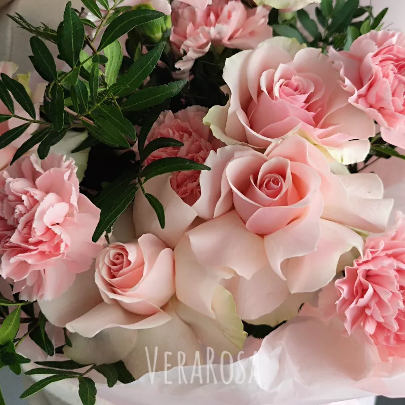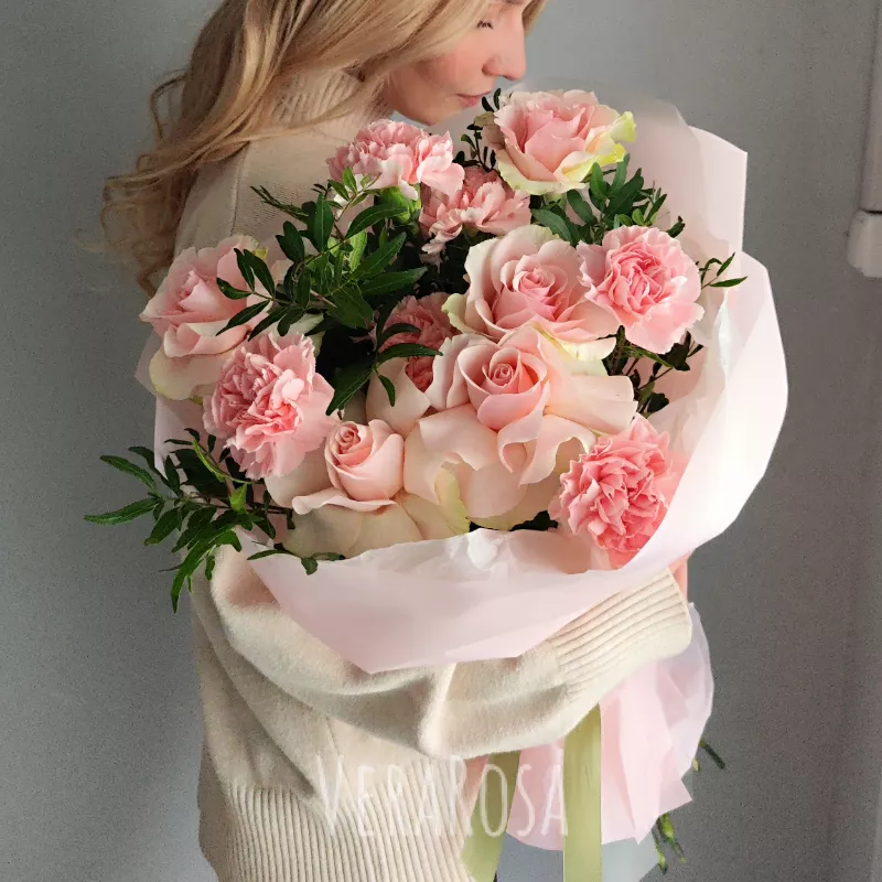 Нежный розовый букет, словно сотканный из летних грёз, станет идеальным выражением вашей любви и внимания. Мягкие оттенки роз и гвоздик переливаются, создавая атмосферу утонченности и романтики. Этот букет прекрасный комплимент, который подарит незабываемые эмоции.