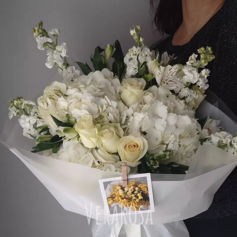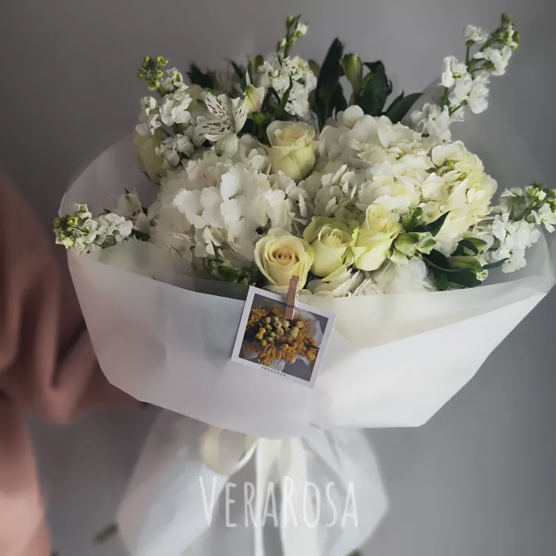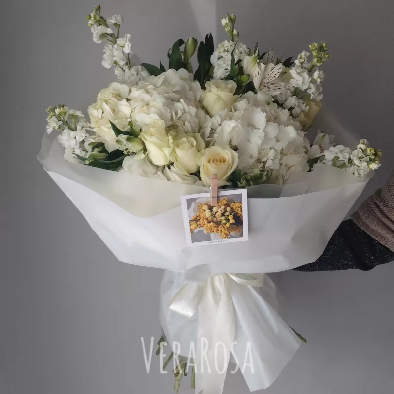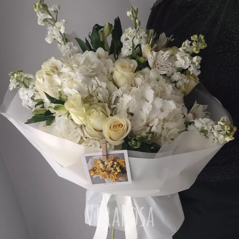 Утончённый букет, составленный из гортензий, медовой маттеолы, роз и альстромерий украшенный атласными лентами и помещённый в изысканную упаковку.