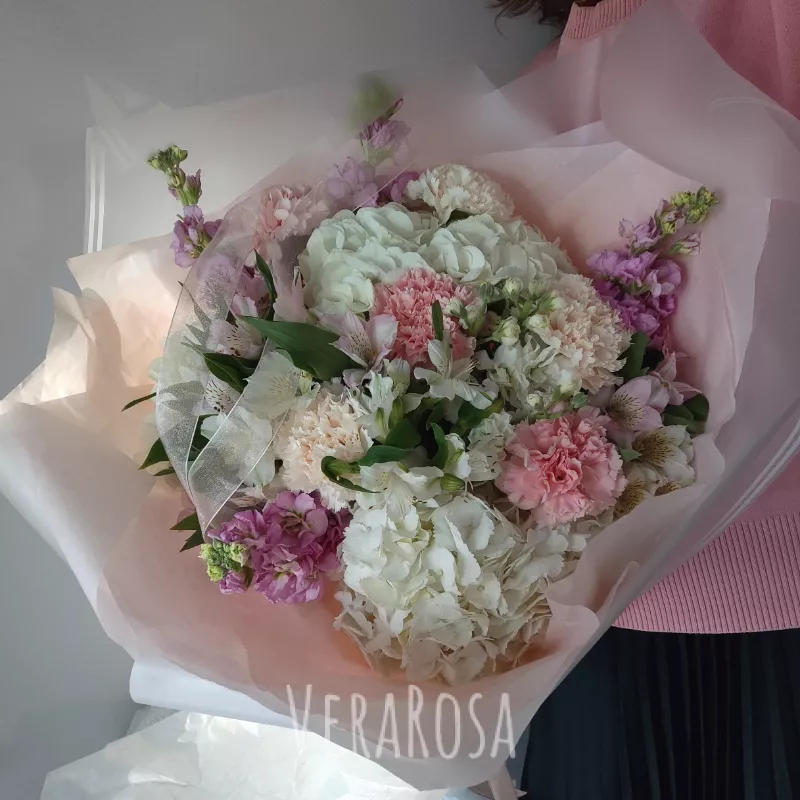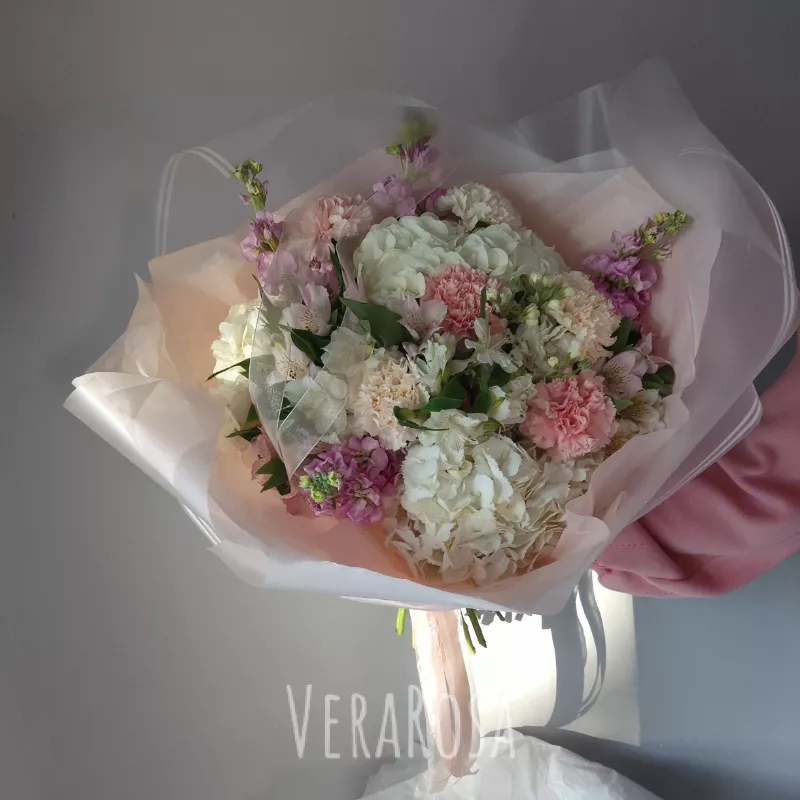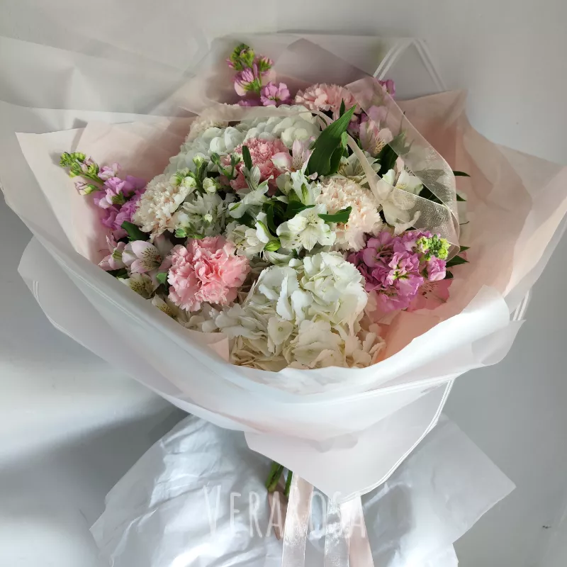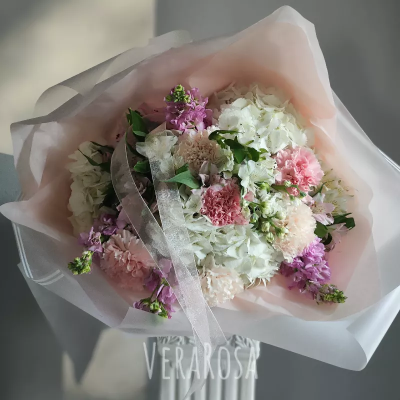 Букет из нежных и воздушных шариков гортензий, маттиолы, грамофончиков альстромерий и диантусов. Оформлен в упаковку и атласные ленты.