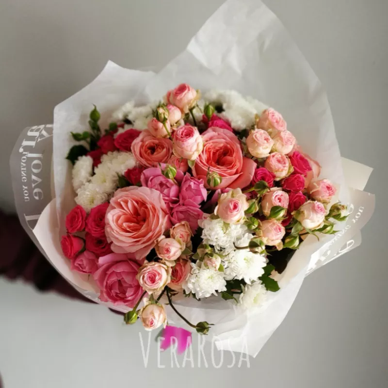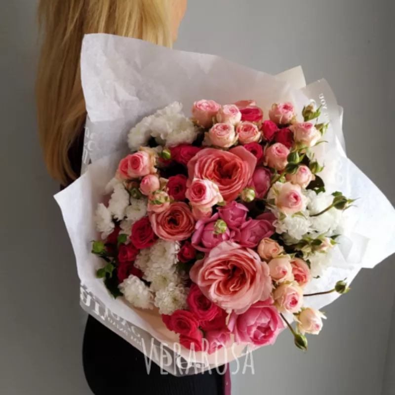 Изысканный букет из пионовыдных кустовых роз и белоснежных веточек сантини. В подарок мини открытка.