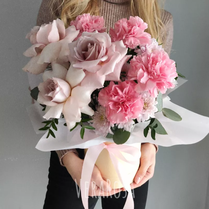 Букет, представленный в нежно-розовой гамме, включает в себя элегантные розы и пышные гвоздики, создавая гармоничное сочетание изысканности и романтичности. Необычная подача в круглой коробке, украшенной шелковой лентой, добавляет композиции изящества и делает её запоминающейся. Этот букет станет прекрасным выбором для выражения чувств и создания праздничного настроения.