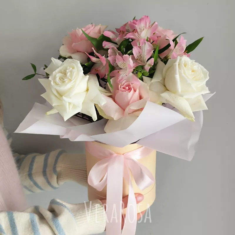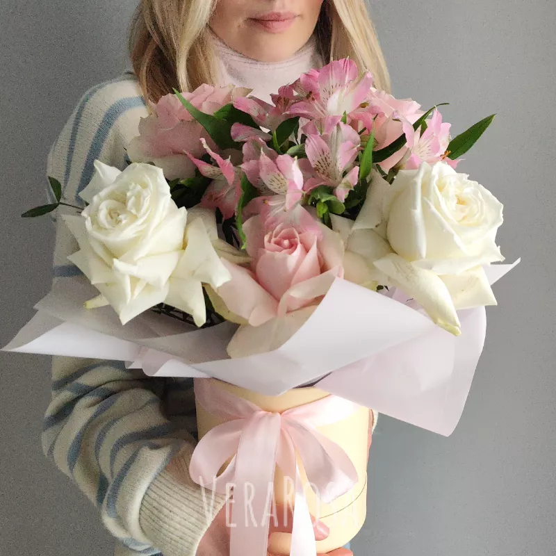 Этот букет нежная композиция из белых роз и светло-розовых альстромерий, создающая воздушный и элегантный образ. Бледные оттенки цветов придают букету особую утонченность и романтичность. Красивая упаковка и нежный бант добавляют завершающий штрих.