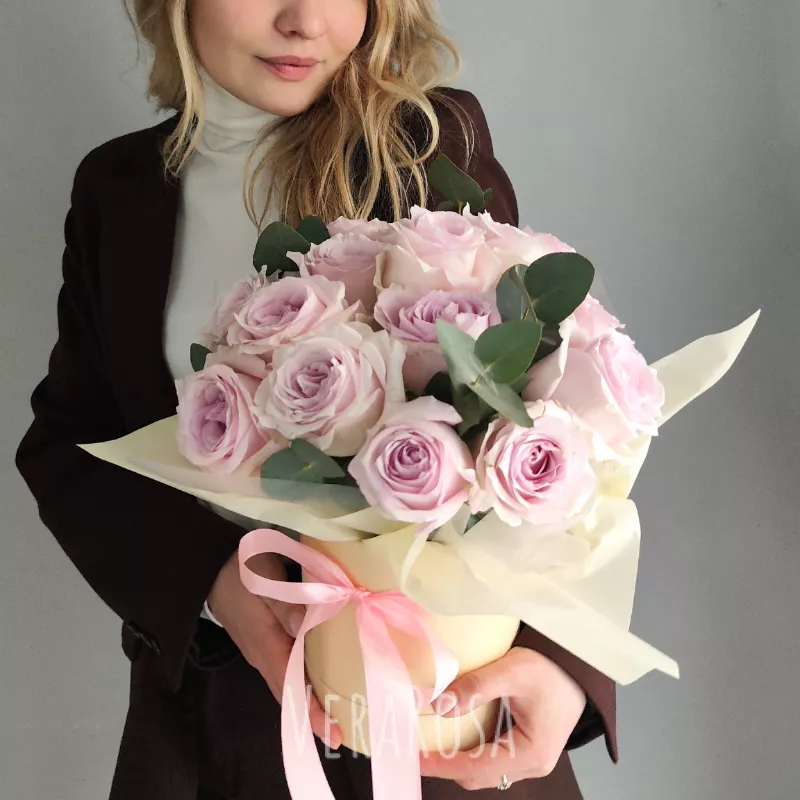 Нежный букет из сиреневых роз, обрамленный зеленью эвкалипта, воплощение утонченности и деликатности. Этот элегантный комплимент в стильной коробке с атласной лентой станет идеальным выражением ваших чувств.