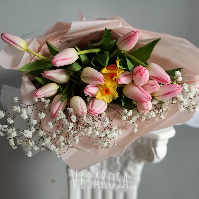 Нежный и стильный букет из тюльпанов, нарцисса и белоснежных веточек гипсофилы.