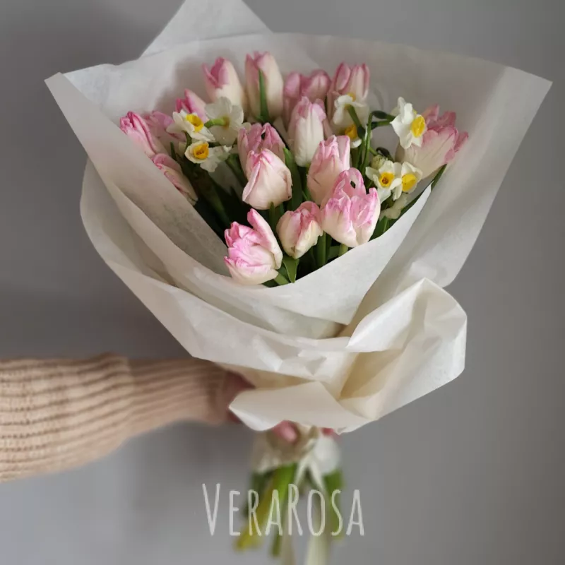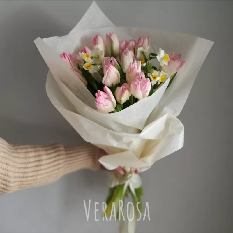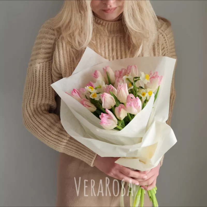 Изящный весенний букет, составленный из тюльпанов и нарциссов, дополненный упаковкой и атласными лентами, станет прекрасным подарком.