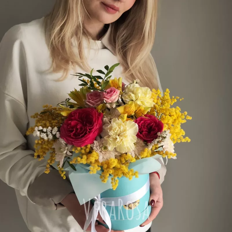 Букет «Весенняя рапсодия» - это яркое и нежное сочетание розовых роз, желтых лилий и воздушной мимозы, создающее ощущение тепла и радости. Композиция изысканно оформлена в голубой коробке с белой лентой, что добавляет ей элегантности и изящества. Этот букет станет прекрасным подарком для тех, кто ценит красоту и гармонию.
