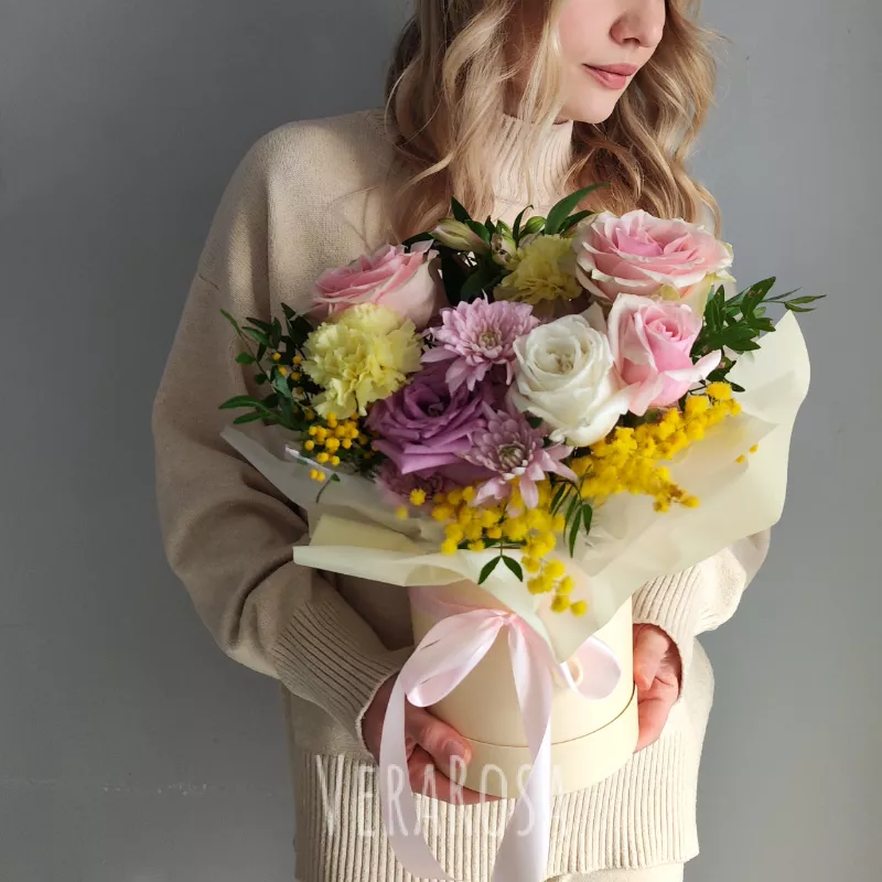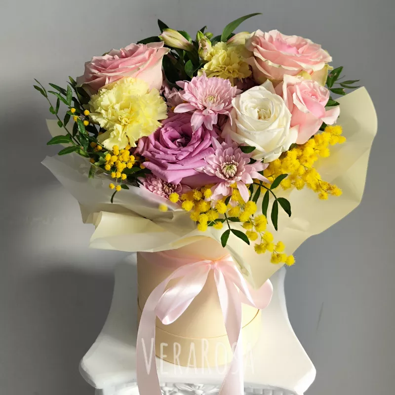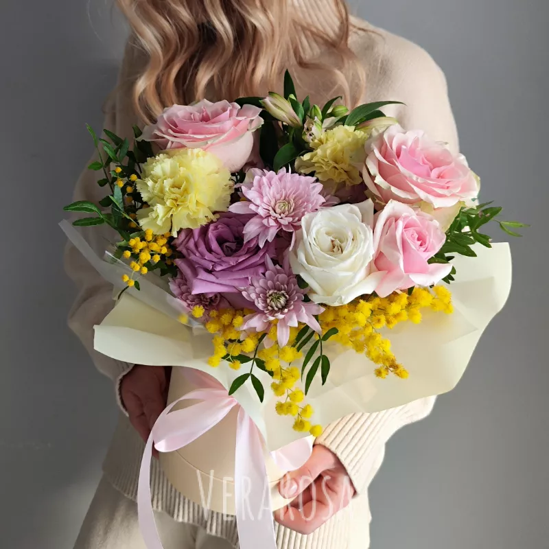 Нежный и изящный букет, в котором розовые и белые розы, гвоздики и мимоза создают легкую и воздушную композицию. Пышные цветы в нежных оттенках наполнены солнечным светом и теплом. Букет станет идеальным подарком для тех, кто ценит красоту и элегантность.