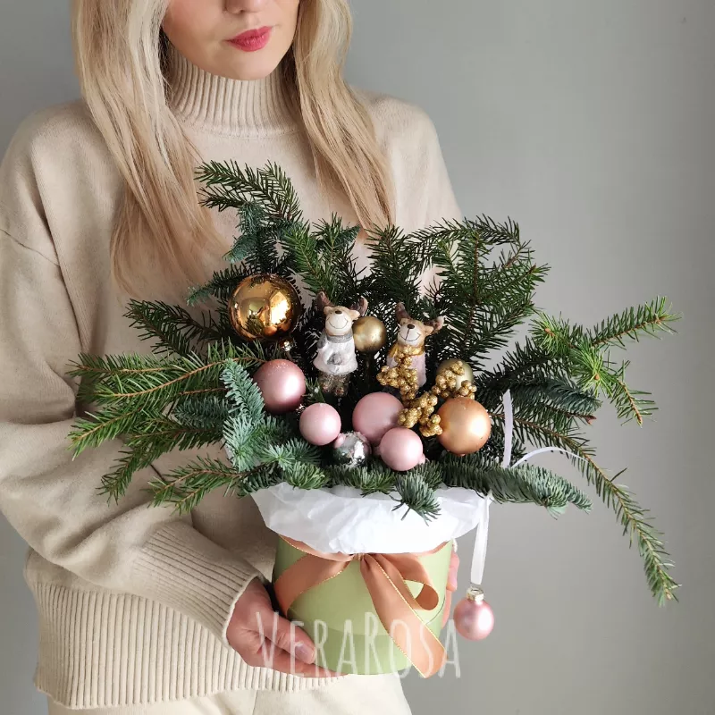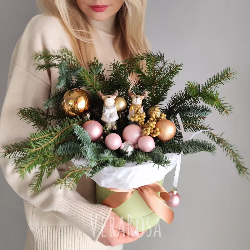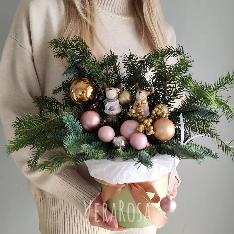 Новогодняя композиция в нежной цветовой гамме никого не оставит равнодушным. Сосновые ветки и украшения в бело-розовых тонах создают атмосферу уютного зимнего праздника. В композиции также присутствуют фигурки оленей, добавляющие композиции сказочности и волшебства.