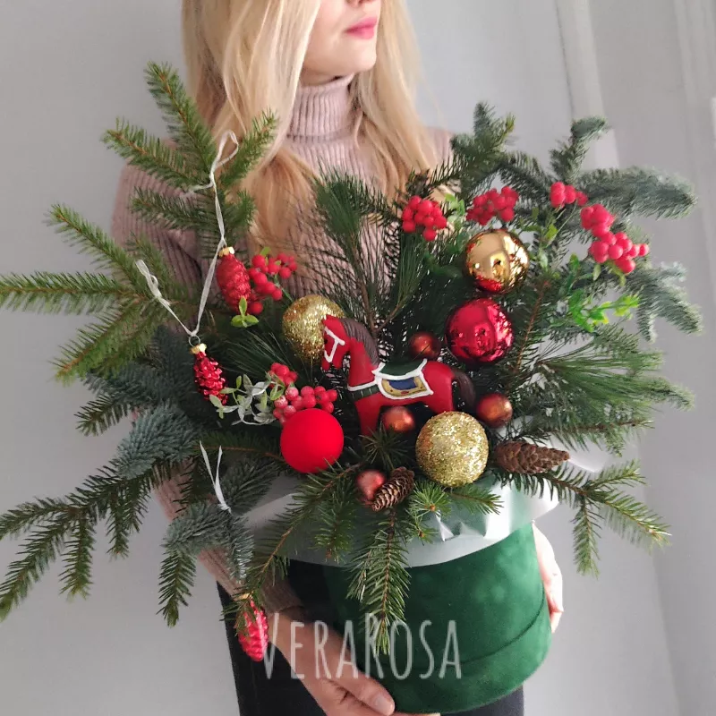 Новогодняя композиция в зелёной бархатной шляпной коробке, украшенная ветками ели, шишками, яркими красными ягодами и блестящими золотыми шарами. В центре букета фигурка красного коня, добавляющая композиции сказочный и праздничный вид. Эта композиция станет прекрасным дополнением к вашему новогоднему интерьеру.