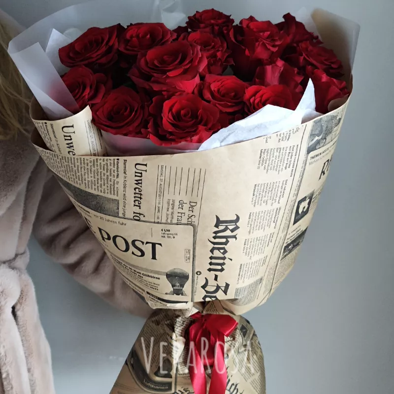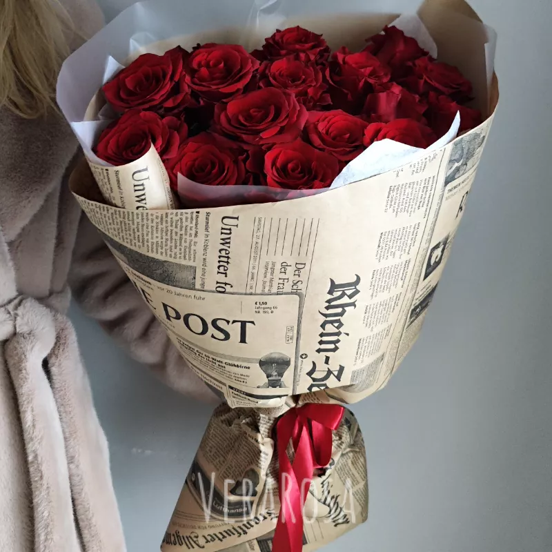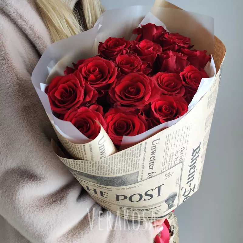 Букет из 15 роскошных красных роз, великолепно оформленный в винтажной газетной обертке и дополненный атласной лентой насыщенного алого цвета. Это классическое сочетание цветов и стильного дизайна создает выразительный образ, идеальный для особого случая или романтического подарка.