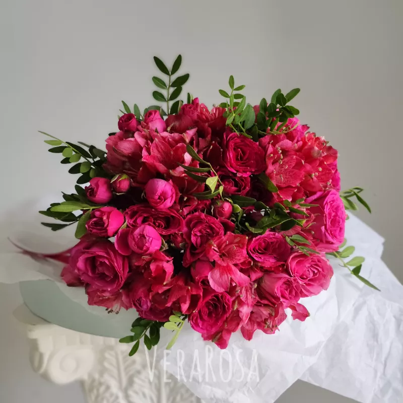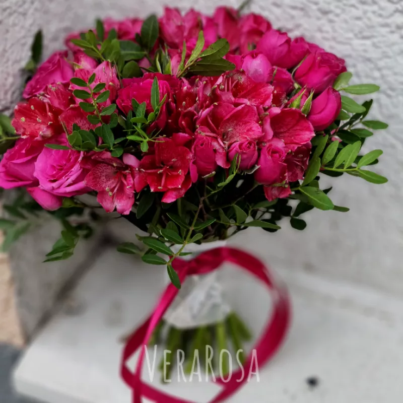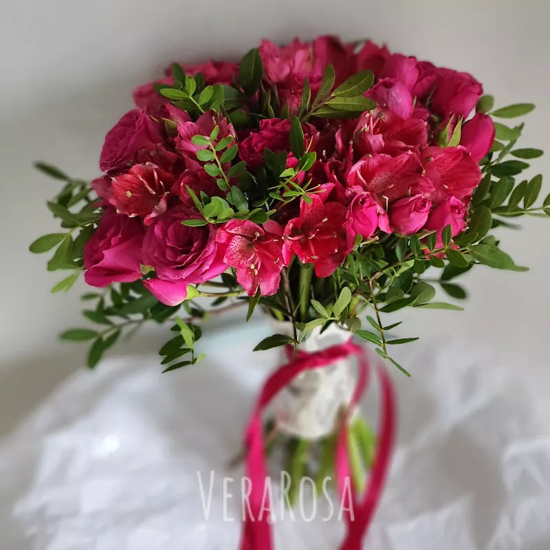 Яркий букет невесты в малиновых оттенках. Оформлен атласными лентами.Обратите внимание, чтобы букет максимально был похож на представленный, оформить заказ лучше всего за 7-14 дней до мероприятия.
